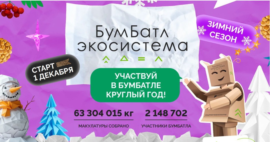 Акция «БумБатл» запускает новогодний конкурс ёлочных игрушек 1 декабря стартовал зимний сезон Всероссийской акции «БумБатл», которая проходит в поддержку нацпроекта «Экологическое благополучие» под эгидой всероссийского Движения «Экосистема». «Зима ...