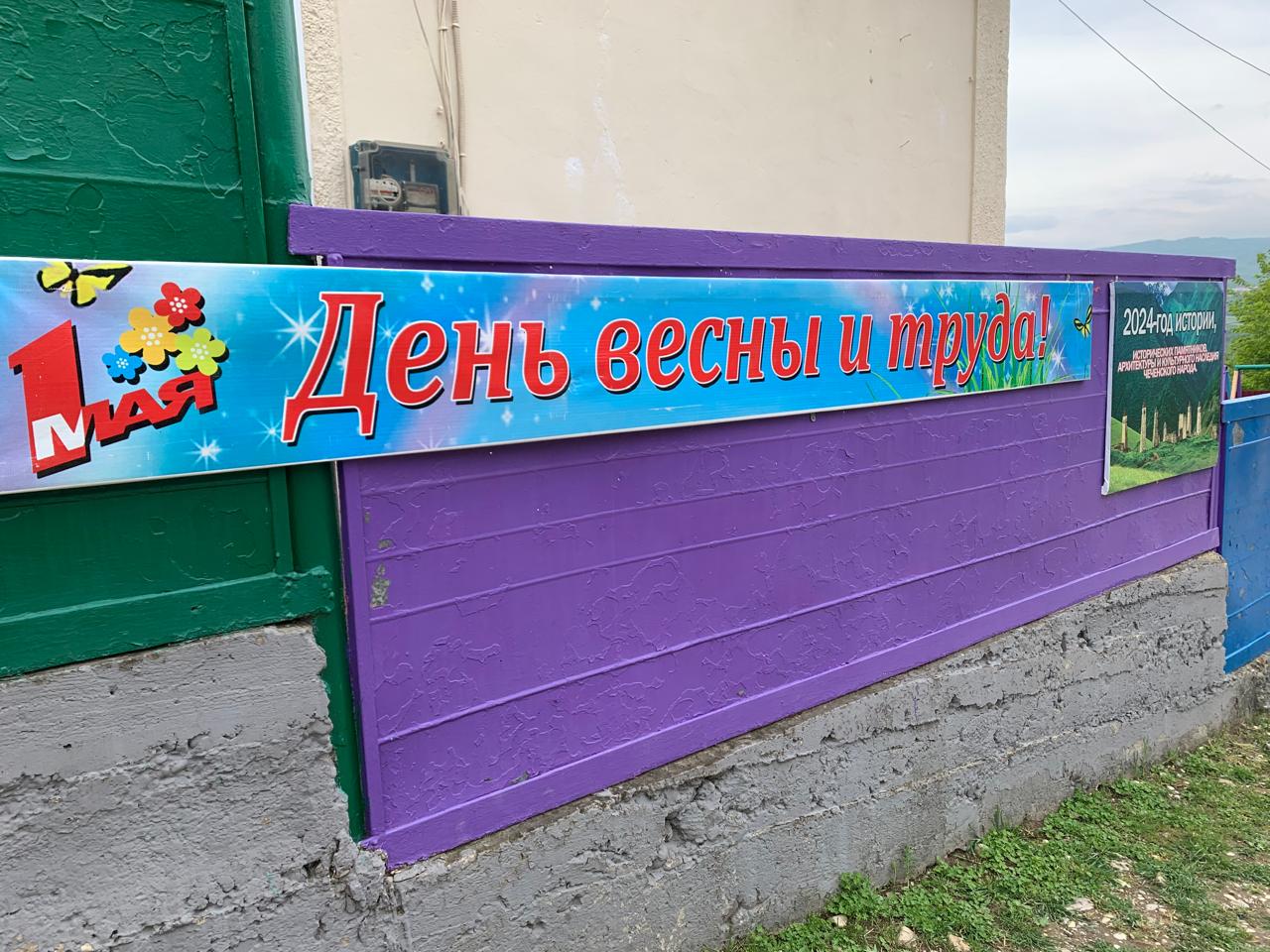 23.04.2024г МБДОУ"детский сад"Теремок" с.Мескеты" был оформлен фасад здания к 1 Мая.